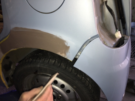 粗出しで残った部分の凹みを板金パテで埋めて補修します